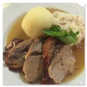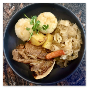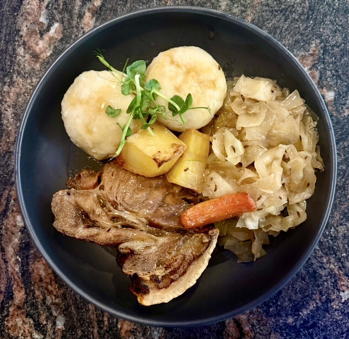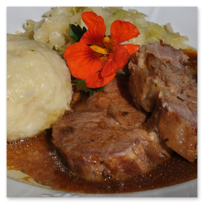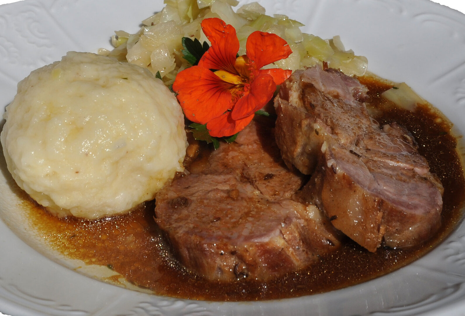 - Beilagen: Erdäpfelknödel, bayrisches Kraut.